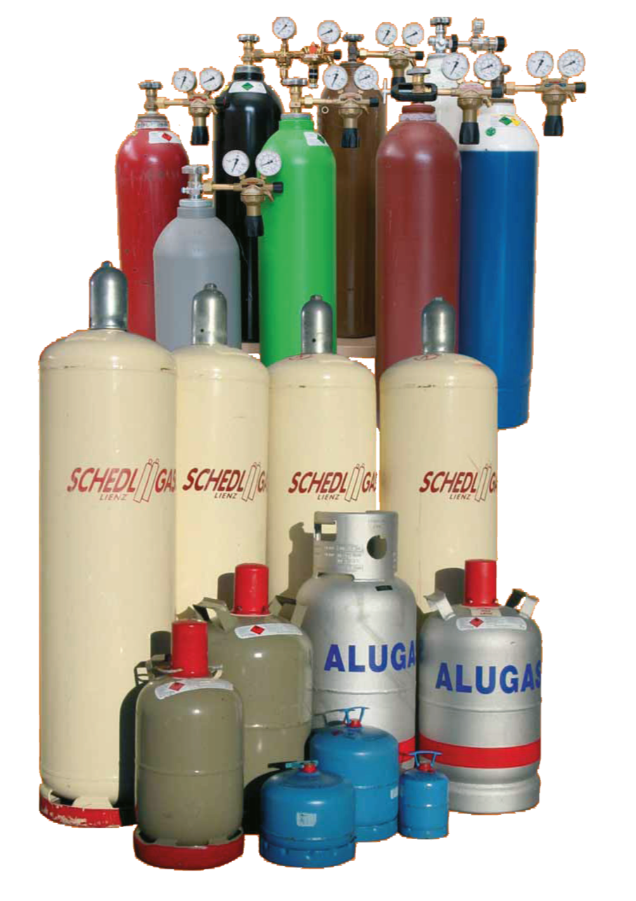Flaschengase in unterschiedlichen Größen zum Kochen, Grillen, Heizen, Kühlen, Beleuchten, Flämmen und für Motoren.